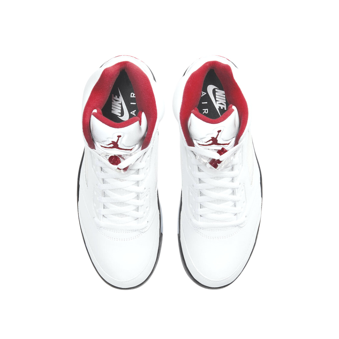 The 2020 edition of the Air Jordan 5 Retro ?Fire Red? brings back the OG colorway of the classic silhouette on the occasion of its 30th anniversary. The build is faithful to the original, featuring a white leather upper with a silver reflective tongue and Nike Air branding on the heel. The black midsole, embellished with red shark tooth detailing inspired by a WWII P-51 Mustang fighter plane, is reinforced by an icy translucent outsole.