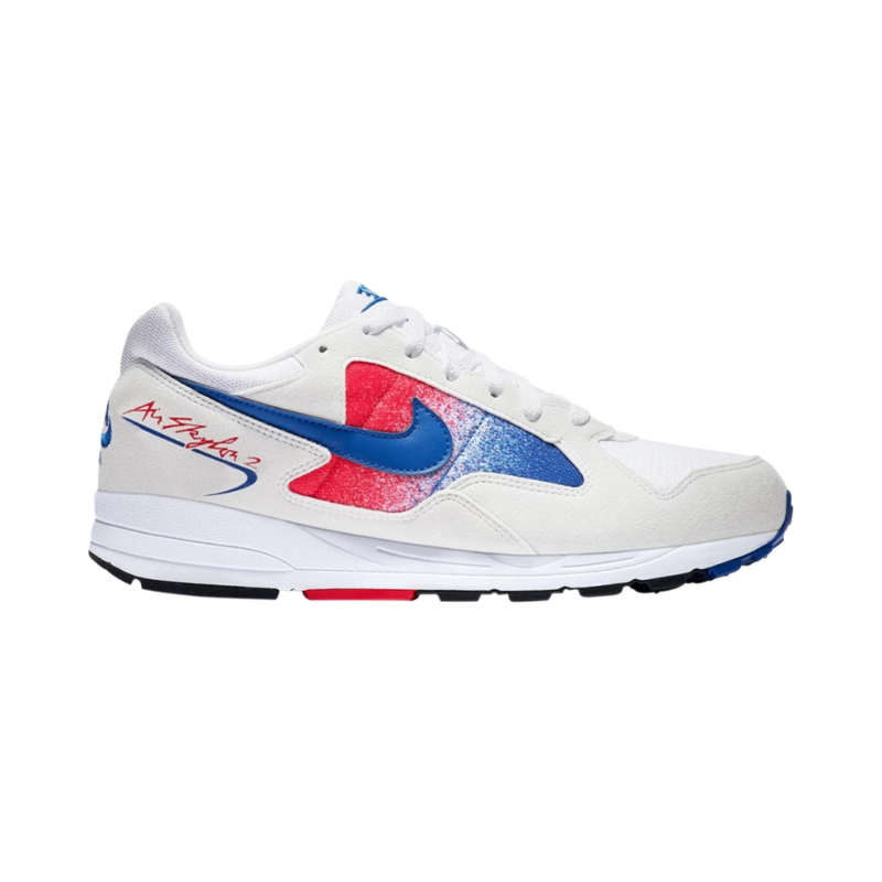 Originally released in 1992, the Nike Air Skylon 2 sneaker makes its retro return for July 2018 in a Game Royal and University Red color palette. The vintage-inspired sneaker sports the same bold branding and silhouette as the original with a White mesh upper and suede overlays. The sidewall features a graphic, retro-style quarter panel with a gradient print that?s offset by a blue Swoosh. Underfoot, a signature Phylon midsole with Air-Sole units at the forefoot and heel uphold the design legacy of the OG model.